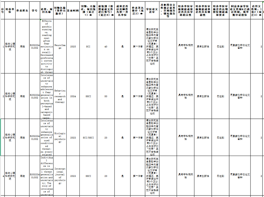 脑与心理科学研究院2025年11月博士研究生创新成果及答辩审核结果公示如下: