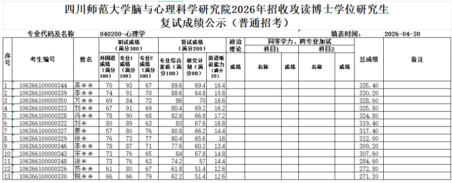 四川师范大学脑与心理科学研究院2026年招收攻读博士学位研究生成绩公示(普通招考)